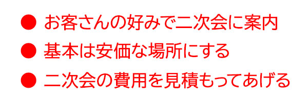 懐の薄いお客さまの場合、スナック・キャバクラ・ショーなど費用の掛かる店は避ける。